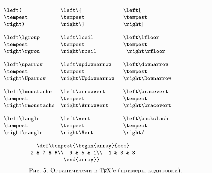 Рис.6. Ограничители - результаты, Таблица ограничителей, Открывающие ограничители, Закрывающие ограничители, \left, \right, \def, \begin, array, \end, &