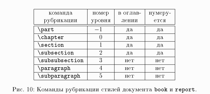 book, report, \part, \chapter, \section, \subsection, \subsubsection, \paragraph, \subparagraph