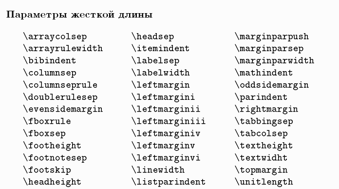 \arraycolsep, \arrayrulewidth, \bibindent, \columnsep, \columnseprule, \doublerulesep, \evensidemargin, \fboxrule, \fboxsep, \footheight, \footnotesep, \footskip, \headheight, \headsep, \itemindent, \labelsep, \labelwidth, \leftmargin, \leftmargini, \leftmarginii, \leftmarginiii, \leftmarginiv, \leftmarginv, \leftmarginvi, \linewidth, \listparindent, \marginparpush, \marginparsep, \marginpawidth, \mathindent, \oddsidemargin, \parindent, \rightmargin, \tabbingsep, \tabcolsep, \textheight, \textwidth, \topmargin, \unitlength
