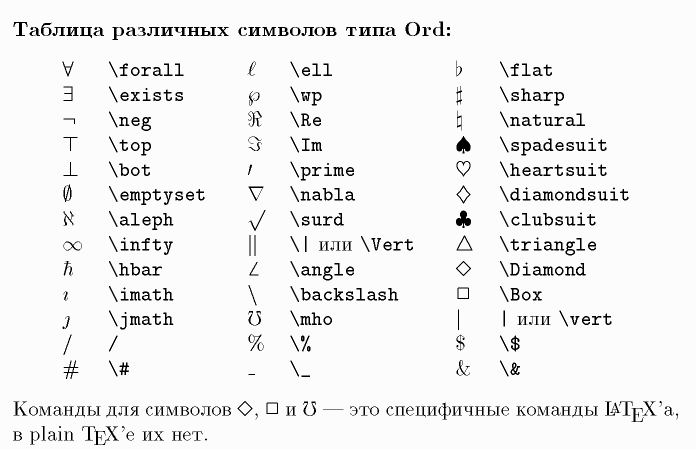 \aleph, \hbar, \imath, \jmath, \ell, \wp, \Re, \Im, \partial, \infty, \prime, \emptyset, \nabla, \surd, \top, \bot, \|, \angle, \triangle, \backslash, \forall, \exists, \neg, \flat, \natural, \sharp, \clubsuit, \diamondsuit, \Diamond, \Box, \mho, \heartsuit, \spadesuit, \hat, \vert, \Vert, $, |, \%, \&, \#, \$