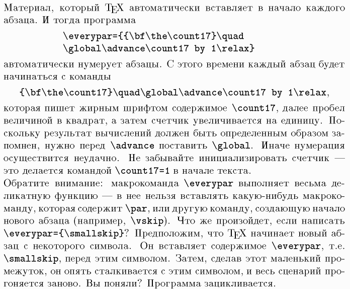 \bf, \the, \count, \global, \advance, by, \quad, \relax, \par, \vskip, \smallskip, plus, minus, pt, \parskip