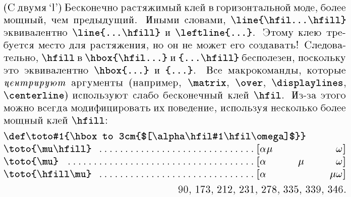 \hfil, \line, \leftline, \hbox, \matrix, \over, \displaylines, \def, \alpha, \omega, \mu, to, #, $
