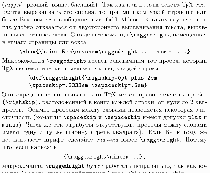\raggedleft, \raggedbottom, \hbox, \hsize, \def, \rightskip, plus, minus, em, \spaceskip, \xspaceskip