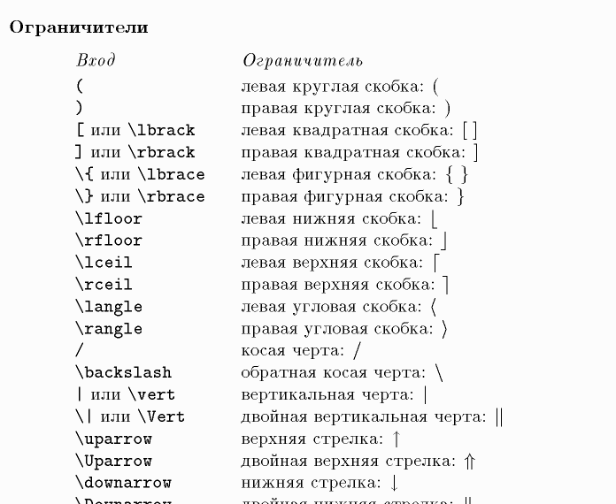 \lbrack, \rbrack, \lbrace, \rbrace, \lfloor, \rfloor, \lceil, \rceil, \langle, \rangle, \backslash, \vert, \Vert, \uparrow, \Uparrow, \downarrow, \Downarrow, \updownarrow, \Updownarrow, \{, \}, открывающие ограничители, закрывающие огрангичители, $