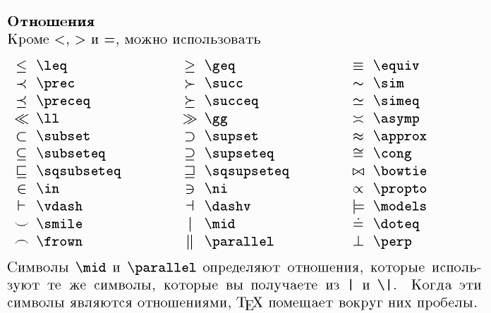 \leq, \prec, \preceq, \ll, \subset, \subseteq, \sqsubseteq, \in, \vdash, \smile, \frown, \geq, \succ, \succeq, \gg, \supset, \supseteq, \sqsupseteq, \ni, \dashv, \mid, \parallel, \equiv, \sim, \simeq, \asymp, \approx, \cong, \bowtie, \propto, \models, \doteq, \perp, $, Отношения с отрицанием