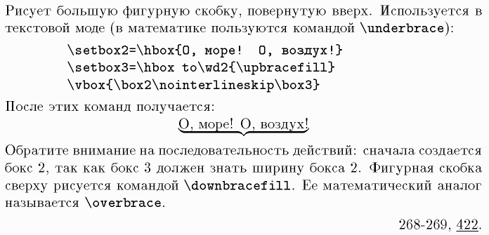 \setbox, \box, \hbox, \vbox, to, \wd, \nointerlineskip, \downbracefill, \overbrace, $